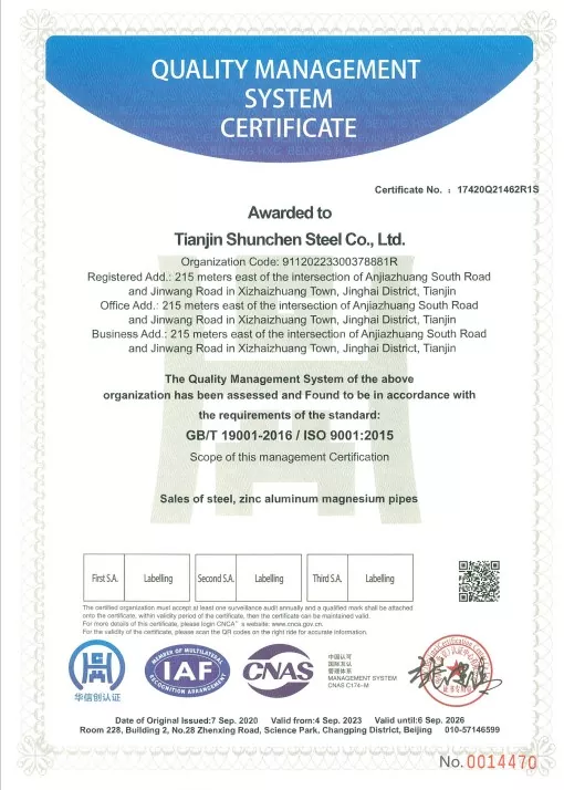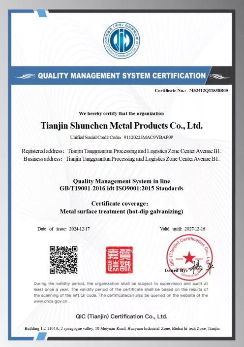 Standarder: GB/T 3091-2015 "Svejsede stålrør til lavtryksvæsketransport", GB/T 13912-2020 "Varmgalvaniserede stålrør". Produktet har bestået tredjepartstest og har en testrapport.