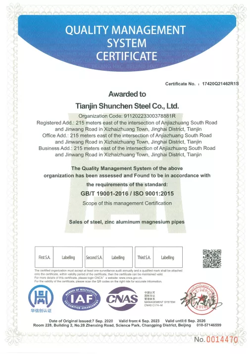 Vores galvaniserede runde rør kommer i en bred vifte af specifikationer med 236 forskellige størrelser for at imødekomme forskellige behov. Vores produkter er ISO9001-certificerede og har ISO 9000, 3A-systemcertificeringer og EU CE-certificering. Vi leverer også materialerapporter, testcertifikater for zinkbelægningstykkelse og tredjeparts kvalitetsinspektionsrapporter. At vælge Shunchuns galvaniserede runde rør giver dig ikke kun one-stop købstjenester, men også 24/7 eftersalgssupport og realtidssporing på 18 nøglepunkter, hvilket gør dit indkøb mere problemfrit og pålideligt.